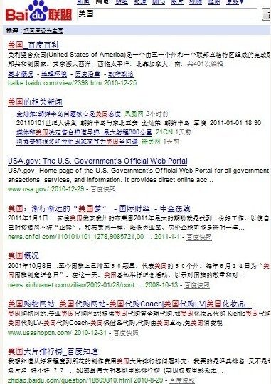 我们在百度搜索美国,可以看到这样的一个结果。会出现有美国国家的介绍,美国最近的一些国家新闻。美国购物的网站。美国地图。美国电影。为什么会这样了。其实很容易解释。大家不要忘记了搜索引擎最大的一个宗旨。就是把最好的搜索结果展现给用户。其实百度有一个原则,就是他希望用户对具体一个关键词的需要能在搜索结果的第一页都获得满足。也就可以解释为当某一个用户在搜索美国的时候,他不知道用户的具体用意。所以就会出现以上的搜索结果。百度发现,在搜索结果第一页中适当放上一些类似58同城或者赶集网的搜索结果,会更好的满足用户的搜索满意度。那么这些对我们的启发是什么?