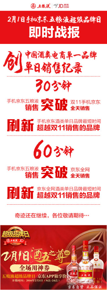 2月1日,手机京东“五粮液超级品牌日—酒五之尊”活动隆重上线,凭借“正品保障+超值回馈+京东物流与服务”,为消费者带来节前购买五粮液的至佳平台,令五粮液品牌在京东的销售不断攀升。数据显示,短短30分钟,手机京东五粮液销售便刷新五粮液品牌双11当天在手机京东的销售,并成功开创中国酒类电商单一品牌单日销售记录。