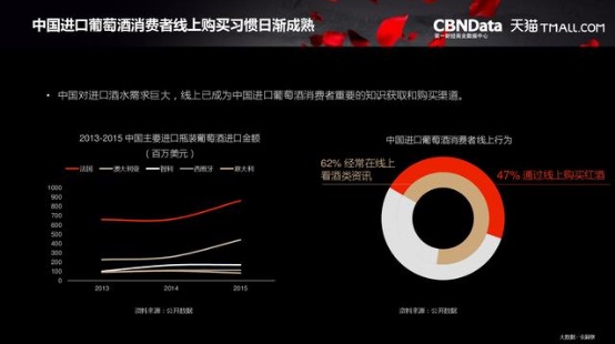 相关数据显示,在进口葡萄酒上,62%消费者经常在线上看酒类资讯,47%消费者通过线上购买红酒。以天猫为代表的线上平台,酒类销售规模及酒类消费客单价也处于逐年上升趋势。从2013年到2015年,天猫酒水用户规模增长近5倍,目前已经有超过一千万消费者在天猫上购买了酒水。