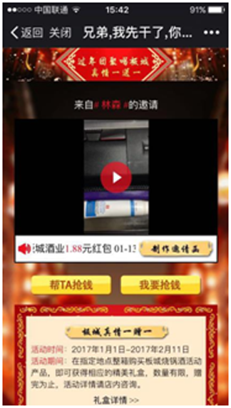 最近小编发现了一个比较特别的活动,这个名为“新年一起喝一杯”的线上营销活动,通过在活动页面传播一首《兄弟一起喝一杯》的音乐mv,用户看到这种情怀满满的mv,也可以根据自己本地的图片和视频在微信即可一键制作一条邀请好友喝一杯的小短片,在转发到朋友圈或者微信好友分享,也不需要下载app,小短片就能转发分享了,这样的形式很利于推广,也很有趣!