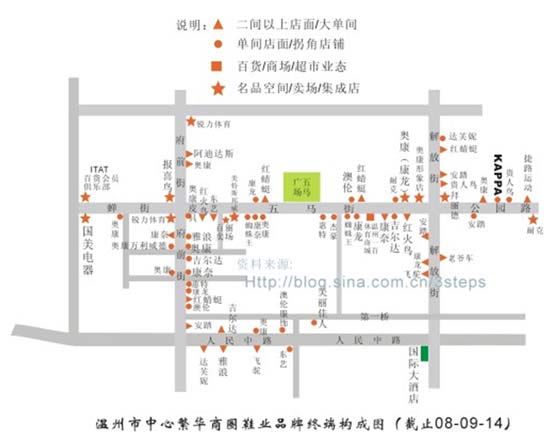 温州中国鞋都家门口的城市繁华街道,有些鞋企经受不了昂贵的租金的上提,先后关门大吉了事,从温州市中心繁华商圈鞋业品牌终端构成图可以看出,强者愈强,弱者愈弱,能在五马街有据点的,也算是洗牌留下来的行业精英,但细分一下,店铺还是有区别的,有些店铺除了死撑面子之外,亏多赚少,有些把店改小或者改位置或者撤下商场的厅柜,也有几个知名的鞋业品牌通过不同定位的“店群”拉动消费,即在五马街、府前街、解放街、人民中路等市中心商圈建立据点,展开营销上的攻势,树立一城领先优势,气势逼人,单店业绩也不错,总之,温州市中心这样的鞋业终端布局在全国也是少见,难怪埠外品牌也望而生畏!