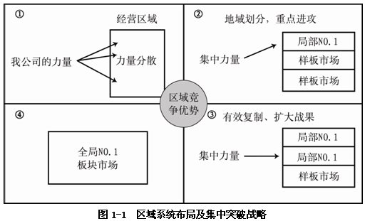 区域集中突破模式,就是首先要拥有大局观,对市场进行整体布局,再集中企业资源和力量在局部区域成为第一,然后集中突破相关联的区域市场,最终在整个区域成为第一。