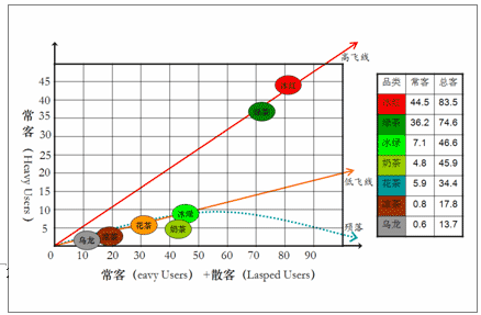 从该图我们可以看到,纵轴是“常客”,而横轴是“常客”+“散客”,也就是说,纵轴代表的是经常购买者,而横轴代表的是所有购买者,那么我们这样就可以理解图中的斜线所代表的意思,斜线飞行的坡度越陡越高,代表着其“常客”越多。