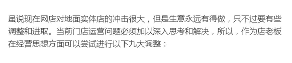 所谓赶客出店,就是店内设置不当,导致进店顾客产生厌烦情绪,缩短留店时间,甚至是直接离店。诸如店内地面有台阶、货架货柜有锐角、店内有挂钟、店内有异味、温度不合适或是通风不佳等等因素。 所以,千万别只顾着发牢骚说生意不好做,先把堵客进店和赶客出店这两个方面进行全面检查。