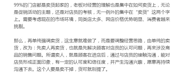 板得先要做好对店员的服务工作,在生活上、工作环境上、情感面子上、多方面且细致的服务好店员,店员自己先得要感受到被服务,然后才有心情来服务好顾客。否则,店员工作情绪不佳,也就没心思来服务好顾客了。