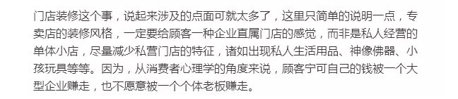 进店的顾客,除了常规的商品采购之后,店里还得要安排点增值服务,即便顾客今天只是来看看,并没有明确的采购意愿,也得提供一定的增值服务。诸如手机充电、体重体脂测量、眼镜清洗、拉链润滑、给顾客的孩子及宠物准备的零食等等,之所以安排这些增值服务,目的很简单,就是增加进店顾客的好感,延长留店时间,同时,也是形成与其他同类门店的差异化。