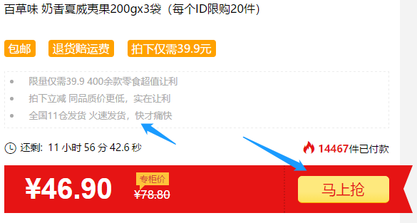双十一当天0~1点,很多商家推出了秒杀产品:前11秒2折、前60秒折上折……时间都设置的非常短。