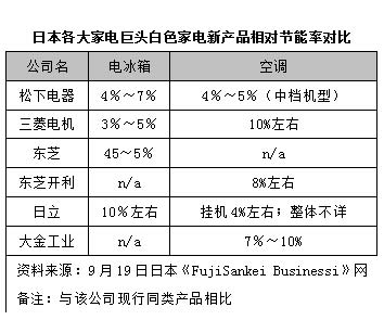 2008年9月,日立公司宣布能够回收利用电机余热烘干衣物的节能型烘干型滚筒洗衣机将于10月12日正式上市销售,实现较去年同类机型节能50%的“节能大跃进”;日本东芝开利空调公司宣布10月21日正式推出13款大清快PDR系列节能空调,该系列空调由于配置了「Dualcomp」节能模式,最小耗电量降至45瓦,较去年同类机型节能40%以上;日本夏普则宣布强化节能产品开发,2012年该公司创业100周年之际,白色家电营业收入较07年翻4倍达到1兆日元带有“节能烙印”的战略目标;一向以节能著称的大金工业“岂甘落后”宣布11月21日开始发售8款配置户外温度传感器湿度控制系统、温度自动调节「舒适eko」自动节能模式“超级节能”R系列空调;松下则弃用日本国民喜闻乐见的“Nationl”品牌,10月份推出“Panasonic”品牌系列节能空调、冰箱等白色家电产品。