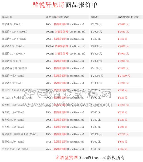 商品名称 商品规格 市场价 名酒鉴赏网市场指导价 芝华士12年(3000ml) 3000ml ¥980元 ¥880元 二号芝华士(375ml) 375ml ¥130元 ¥110元 百龄坛21年(750ml) 750ml ¥1230元 ¥1030元 百龄坛21年 750ml ¥918元 ¥850元 马爹利名仕(350ml) 350ml ¥230元 ¥200元 马爹利