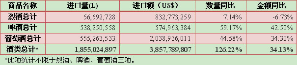 2015年进口酒市场呈现非常乐观的增长态势,全年累计进口金额38.6亿美元,达到了一个新的峰值;其增速也是2013年探底之后的最大反弹,一跃超过了30%。其中,啤酒、葡萄酒的数量和金额均大幅增长,唯独烈酒的进口金额有一定程度下降,但下降幅度明显趋缓。