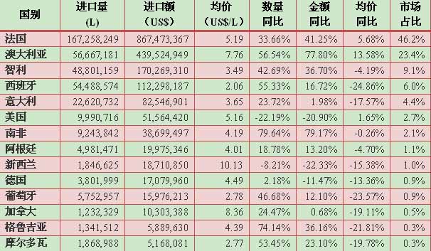 随着消费者对葡萄酒的认知水平不断提高,原瓶装进口葡萄酒日益受到消费者的青睐和经营者的重视,2015年的瓶装酒进口量达到了3.96亿升,金额更是达到了创记录的18.8亿美元,为历年之最。其中法国、澳大利亚继续领跑,特别是澳大利亚的进口均价不仅持续上涨,其市场份额也由18.1%增至23.4%。 除了法国、澳大利亚和美国,大部分进口来源地的进口均价都有所下跌,这有利于更好地拓展中低端消费市场,但是进口葡萄酒的市场竞争必将日趋激烈。