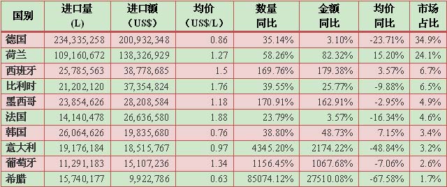 从进口企业方面看,啤酒进口市场的赫芬达尔—赫希曼指数为190,属于高度竞争市场。