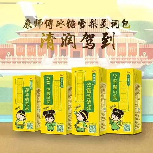随着《诗词大会》、《朗读者》等节目的走红,大家对中国传统文化的热情日渐增长,康师傅也借机将古人的文学智慧诗词,与传统的饮食智慧冰糖雪梨结合推出美词包,由此拉开品牌年度“清润驾到”主题传播,在众多使用网络流行词的品牌中显得格外清新。