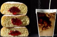 名静物摄影师和一位食物造型师以把物体整齐切成两半的陌生角度,拍摄甜甜圈、咖啡和汤罐头等常见食物和饮...