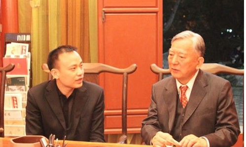 黄大洲先生(右)与叶董亲切交流 原台北市市长、台湾园山饭店董事长黄大洲先生一行莅临九峰茗茶西湖茶社。黄