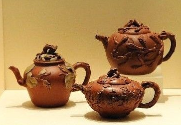 在日本早在江户时代末期,紫砂壶就已经传入,其中有刻有“惠孟臣”和“陈鸣远”款的。明治年间,日本常滑陶公曾聘请苏州籍紫砂艺人金士恒去日本传授技艺。日本学者奥兰田收藏中国名壶32件,其中紫砂壶29件,并与1874年编纂《茗壶图录》,刊行于世。紫砂花盆也于乾隆年间开始传入日本。清代外销的紫砂壶,在泥料的选配和造型方面变化多样,但绝大多数出于对实用性的考量,造型比较古朴,出水顺畅。其多以朱泥制作,常加以贴花、镂空、泥绘等手法,这也成为了其区别于一般紫砂壶的最重要的三大技法。在去年北京的春拍中,就有一件朱泥镂空贴花梅报春纹壶,估价4万至5万元,成交价则达到了近7万元。壶盖与壶身以镂空形式雕刻梅报春图,盖钮立塑梅干与盖面梅树相连,壶身上下饰以螭龙图案相互呼应,工艺复杂。壶柄、盖钮、壶流皆以鎏金链条相连,更显富贵华丽之气。另外还有专为出口东南亚各国制作的紫砂壶,如泰国拉玛五世(光绪年间),曾向宜兴定制过一批紫砂壶,现仍有一部分保存在泰国。清光绪年间,更有大量紫砂器销往日本,墨西哥和南美各国。