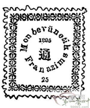 货币的最初样本是附在一封寄给美国沃拉普克语专家查理斯的信件当中。查理斯1888年著有《沃拉普克语手册》一书,还曾担任过美国国际工会储蓄银行驻厦执行总裁。他所收到的这份样本比较粗糙,以邮票的样式,用红墨汁印制在薄白纸上,边缘为锯齿状(如图所示,在此暂称其为“通”字票)。“通”字票的票中上方写有“Mon bevünetik”,其意思是“money between nation”,即“国际间货币”。 中间为中文的“通”字,为通行、流通之意,“1895”则是此票发行年。下方“Franazim”代表法郎货币,下方数字为“25”,表示25生丁,即四分之一法郎。