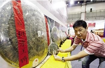 昨日,历时4天的“2013中国(武汉)国际茶业博览会”(以下简称“武汉茶博会”)在武汉国际会展中心开幕,来自全国近200家企业参展,展品中一块重达40公斤的普洱茶饼,赚足了消费者眼球。