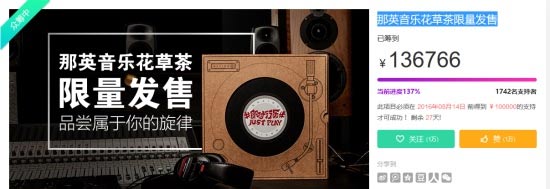 日前,一款“那英音乐花草茶”出现在京东众筹平台,上线5小时即完成全部众筹金额10万元。截至今日,已获得1742名支持者,筹到136766元。