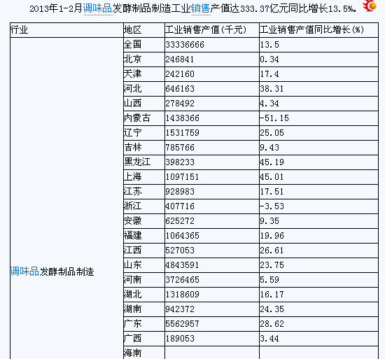 首页食品饮料调味品 调味品 2013年1-2月调味品发酵销售产值分析 未知 2013-04-24 09:27 调味品 上一篇定西鸿鑫调味品的鸡肉料不合格中国质量新闻网消息 甘肃省质量技术监督局19日通报2013年第1季度食品质量监督抽查情况,检出不合格食品共 上一篇2013年1-2月调味品发酵销售产值分析 相关文章 海天味业销售网络遍及全国 规模经营优势显著 千禾味业发展步履维艰 佳隆股份“互联网+”布局多元销售模式 武都花椒借助电子商务销售价格大幅提高 味事达强势植入《好先生》销售喜人 食盐专营制度未取消 盐企有销售和定价权 调味品行业的大数据 番茄酱营养丰富,海外销售火爆 海天味业约2/3销售收入来自酱油 湖北味企“调”出160亿产值