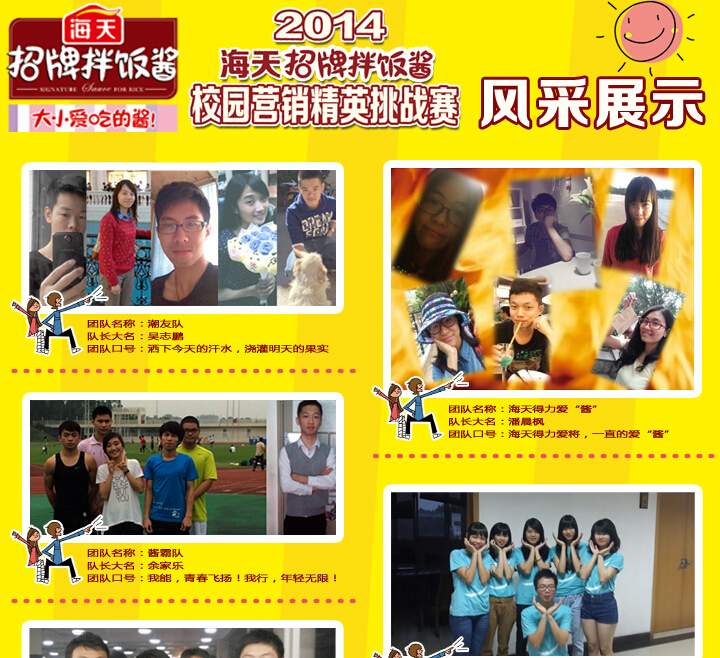 海天招牌拌饭酱2014校园营销精英挑战赛是由海天味业携手全国知名高校,以海天旗下热销酱料海天招牌拌饭酱