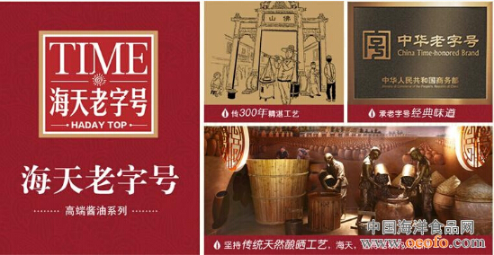 “海天老字号”高品质头道酱油,传承300年佛山古酱园传统工艺,来自北回归线全球最大规模阳光晒场,经180天以上纯天然阳光晒制,全部抽取第一道特级原汁精华,历经494道品控全程把关,绝不添加防腐剂,完美诠释了“醇厚、纯粹、鲜美、淡雅”的海天高端品质。“海天老字号”是海天调味的高端酱油系列,有着极高的性价比,完善和拓展了海天的产品体系。相比普通酱油,“海天老字号”更营养更健康,头道原汁,酱香浓郁,柔滑如油,色泽红亮,开瓶后,即可闻到浓郁酱香。