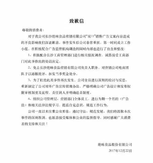12月22日消息,绝味食品发布公告称,因违反广告法相关规定,公司被罚款60万元。原因是绝味鸭脖在双十一前夕在其天猫旗舰店上推出的一张海报引起的,网友举报后该海报被撤下,但时隔一日,绝味鸭脖官方微信再次推送低俗的广告文章。