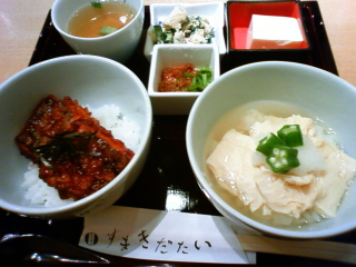 小心翼翼地走进这家豆腐店,发现其装饰之精致,可以和五星级的酒店媲美。这家名叫“京乃豆腐屋藤野”的豆腐店共分成两部分,一部分是卖豆腐的门脸,另一部分是吃豆腐料理的店铺。听店长说,这家豆腐店的总部在京都,京都最出名的菜肴就是豆腐料理。