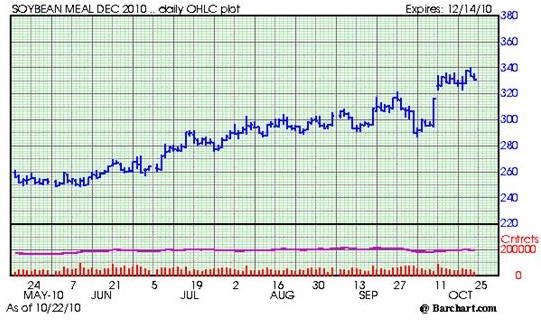 10月22日收盘时,12月豆粕合约比一周前上涨了2.70美元,报收330.90美元/短吨;1月合约上涨3.10美元,报收332.50美元/短吨。
