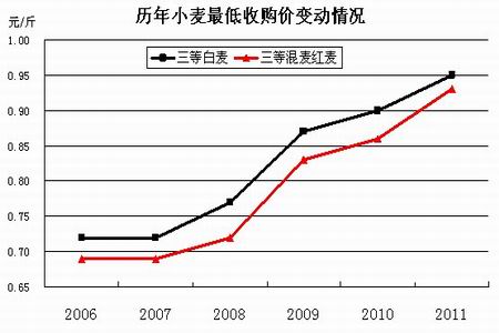 10月12日,据国家发改委网站信息,为保护农民种粮积极性,进一步促进粮食生产发展,经国务院批准,决定从明年新粮上市起适当提高主产区2011年生产的小麦最低收购价水平。白小麦及混麦、红麦(三等,每斤)价格分别从0.9元和0.86元提高到0.95元和0.93元,分别提高0.05元和0.07元,品种价差从过去的0.04元缩小到0.02元,等级价差不变。
