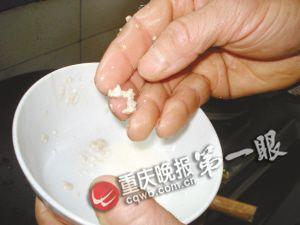 随后,记者在家中用面条做实验,发现面条浸水发胀后有点粘稠,搓揉后发黑现象没有胡夕模做实验时那么明显。