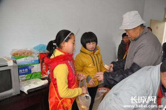 3月16日,清河县小学生志愿者到敬老院送爱心,给老人送牛奶、蛋黄派等食品。王双乔/供图