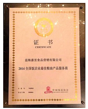 益海嘉里在第三届中国饭店产业发展大会暨中国饭店文化节上获得2014全国饭店业最佳粮油产品服务商称号,作