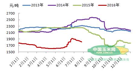 三是下跌通道提前启动。相较于往年同期,今年玉米价格下跌时点有所提前,往年多在8月之后甚至10月份玉米价格才开始呈现下滑态势,今年该时间拐点则出现在6月下旬。6月下旬开始,华北企业前期拍卖的定向粮逐渐到厂,企业原料供应紧缺局面得到一定缓解,华北价格陆续开始回调。7月14日开始国家开始拍卖2013年“分贷分还”临储玉米,并且第二周拍卖数量大幅从400万吨增加至600万吨,同时市场传言新增1000万吨临储转国储轮换玉米,玉米去库存步伐加速,对市场心态造成打压,华北价格应声而落。