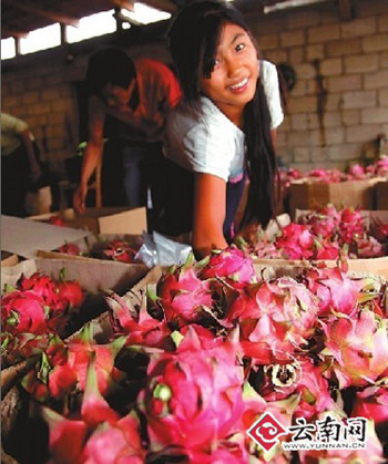 自2006年引种培育成功后,云南西双版纳红皮红肉的火龙果就以其口味香甜“火”了起来。记者日前采访中了解到,以绿版纳农业科技发展有限公司为龙头种植的上千吨版纳火龙果,采摘的当天即通过飞机运抵北京、上海和广州等大城市上市销售,而版纳当地人却很难尝到本地的这种美味。