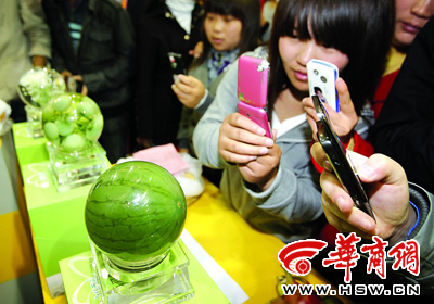 昨日中午,在十七届农高会高新技术馆(A馆)内,一只被“装”在玻璃球里的西瓜吸引了众多参观者的目光。