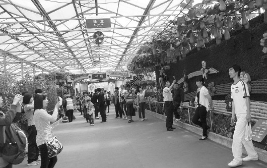 □宋学宝 报道 游客在用蔬菜制成的景点前留影。 展会如鸡肋,不看遗憾,看了更遗憾。这是许多人对一些应景式