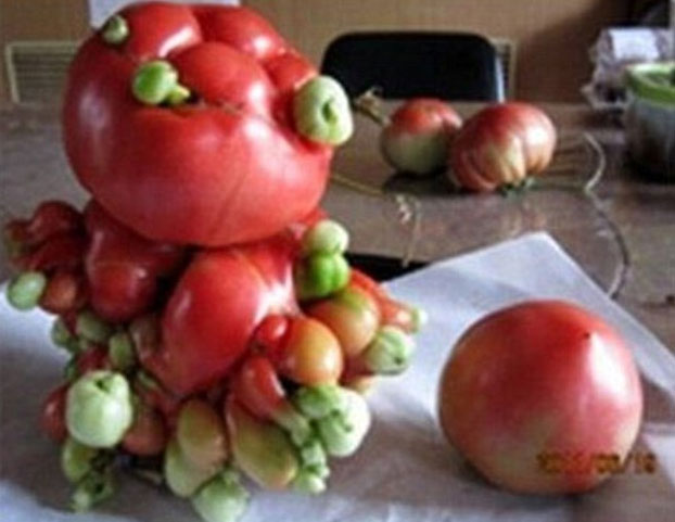 一家韩国网站近日发布了被核辐射污染的花、蔬菜和水果的照片。照片中,多数果实畸形、表面长满肿块。两个桃子摞在一起凑成数字“8”的形状,四个橘子从茎部起就连在一起,一朵蘑菇直接被自己的茎穿透,包菜是正常大小的四五倍。另外,照片中一根茄子的茎上竟像香蕉一样长出多个茄子,黄瓜上冒出了叶子,西红柿上发出了绿芽,小萝卜长出了五根手指,就连向日葵一个花盘上也长出了“多张脸”。