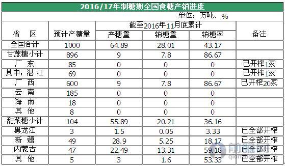 截至2016年11月底,2016/17年制糖期北方甜菜糖厂已全部开机生产,南方甘蔗糖厂也相继开机生产。全国已经开工生产的糖厂有46家,比上制糖期同期少开工8家。