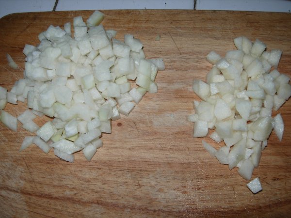 首先准备萝卜和梨,适量切小丁
