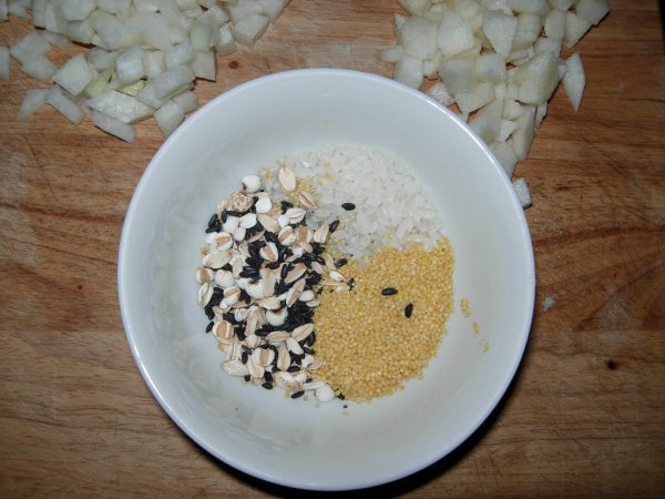 取适量核桃和玉米、还有提前泡好的黄豆,小米、大米、黑米、麦片等,这些就随自己喜欢了,随意选择添加各种谷物,只要你觉的有营养的都可以放些。