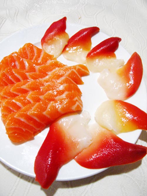 三文鱼含有较多的水分和脂肪,所以用于烹制热菜时,加热的时间不宜长,否则成菜后,肉质会干硬,吃起来口感不佳。这里特别提醒大家,三文鱼用于制作热菜时,其最佳成熟度为七成熟,三文鱼原料在这样的成熟度,口感才软滑鲜嫩、香糯松散。