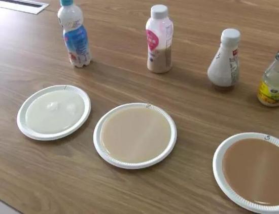 这几种含乳饮料口感非常的香甜,而且有牛奶那种粘稠度质感。随后,记者将这些饮料分别倒出取样,并且和鲜牛奶作对比。