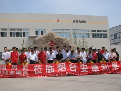 中国男子篮球队在12日晚战胜克罗地亚国家队之后,于6月13日上午,兴致勃勃到牟平参观了烟台安德利果胶公司。