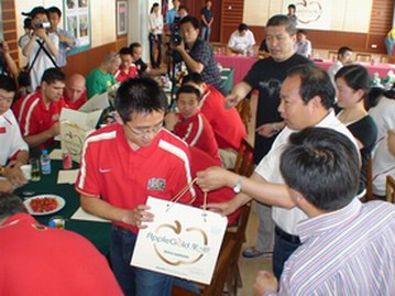 首先,烟台安德利果胶公司总裁张安明先生用中文和英文致欢迎词,热烈欢迎中国男子篮球队一行来公司参观,表示了对中国与克罗地亚男子篮球队挑战赛圆满成功表示祝贺,并介绍了安德利集团公司及安德利果胶公司情况。然后,安德利集团董事长王安先生向中国男子篮球队教练员和众位球星一一颁发了由安德利果胶最新研制的果之胶赠品,并同他们一一握手接待,并表示一定要弘扬中国男篮的拼搏精神,把果胶产业进一步做大做强。教练尤纳斯、郭士强、巩晓彬和队员李楠、王治郅、易建联及全体队员对果胶公司打造循环产业十分赞赏。随后,公司员工与中国男子篮球队教练员和众球星之间展开了签字、交谈、留影等友情互动。