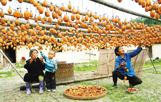 金秋十月,云和县赤石乡库北店子村漫山遍野一片金黄,上万斤柿子成熟了。村民通过传统手法——煮、焙、烘、晒,精制而成的柿干深受市民喜爱,一只柿干能卖2元钱。