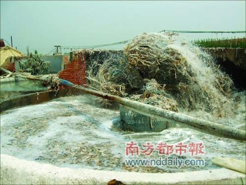 翻转的洗皮机正在池中刷洗皮料。 通常清洗三四个小时后,又脏又硬的废皮革就变得干净、柔软了。 三聚氰胺事件之后,食品添加剂问题阴云未