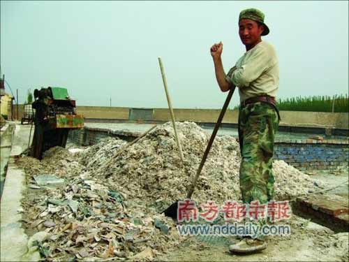 什么叫“皮革水解蛋白”?王丁棉说,就是用城市垃圾堆里的破旧皮衣、皮箱、皮鞋,还有厂家生产沙发、皮包等皮具时剩下的边角料,经过化学技术处理,水解出皮革中原有的蛋白。