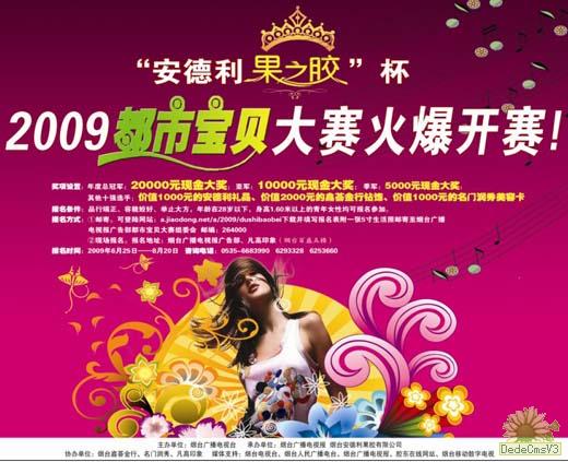 你想成为万众瞩目的璀璨明星吗?你想为平淡的生活增添无限激情吗?你想让自己的青春留下永久的浪漫回忆吗?……2009都市宝贝新赛季的舞台将让青春女孩、时尚丽人、魅力女孩、知性玉女、花季女孩梦想成真!只要你热爱表演、具有基础才艺,五官端正、身体健康、年龄在28岁以下、身高1.60米以上均可报名参与。都市宝贝大赛一贯坚持公平公正公开的赛场规则,机遇对每位选手是绝对平等的。站在2009的梦想舞台,挑战自我,实现人生超越,只要你有勇气,成功就在不远处! “安德利果之胶杯”2009第三届都市宝贝大赛将分牟平、芝罘、蓬莱三个赛区进行海选,前20强选手晋级复赛,复赛产生十强选手,十强选手将在最灿烂夺目、最精彩激烈的总决赛舞台上争夺冠、亚、季军宝座,同时,观众和评审团将共同推选出最佳上镜宝贝、最佳气质宝贝、最具智慧宝贝、最具人气宝贝、最佳活力宝贝、最具亲和力宝贝、最佳才艺宝贝等个性大奖。前三甲选手将荣膺20000、10000、5000元现金,超值大奖前所未有;十强选手还将获得丰厚礼品及组委会认定的获奖证书。更为重要的是,脱颖而出的都市宝贝将从此踏上前景无限的艺术之路,有机会成为安德利果之胶的品牌形象大使。