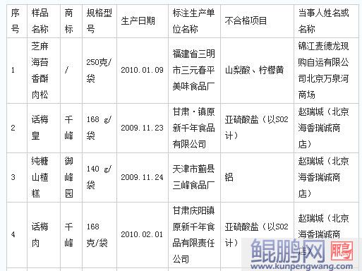 北京市工商局昨日通报,9种不合格食品全市停售。其中,锦江麦德龙北京万泉河商场因销售问题芝麻海苔香酥肉松登上黑名单,这批肉松来自福建省三明市三元春平美味食品厂,存在山梨酸、柠檬黄超标的情况。